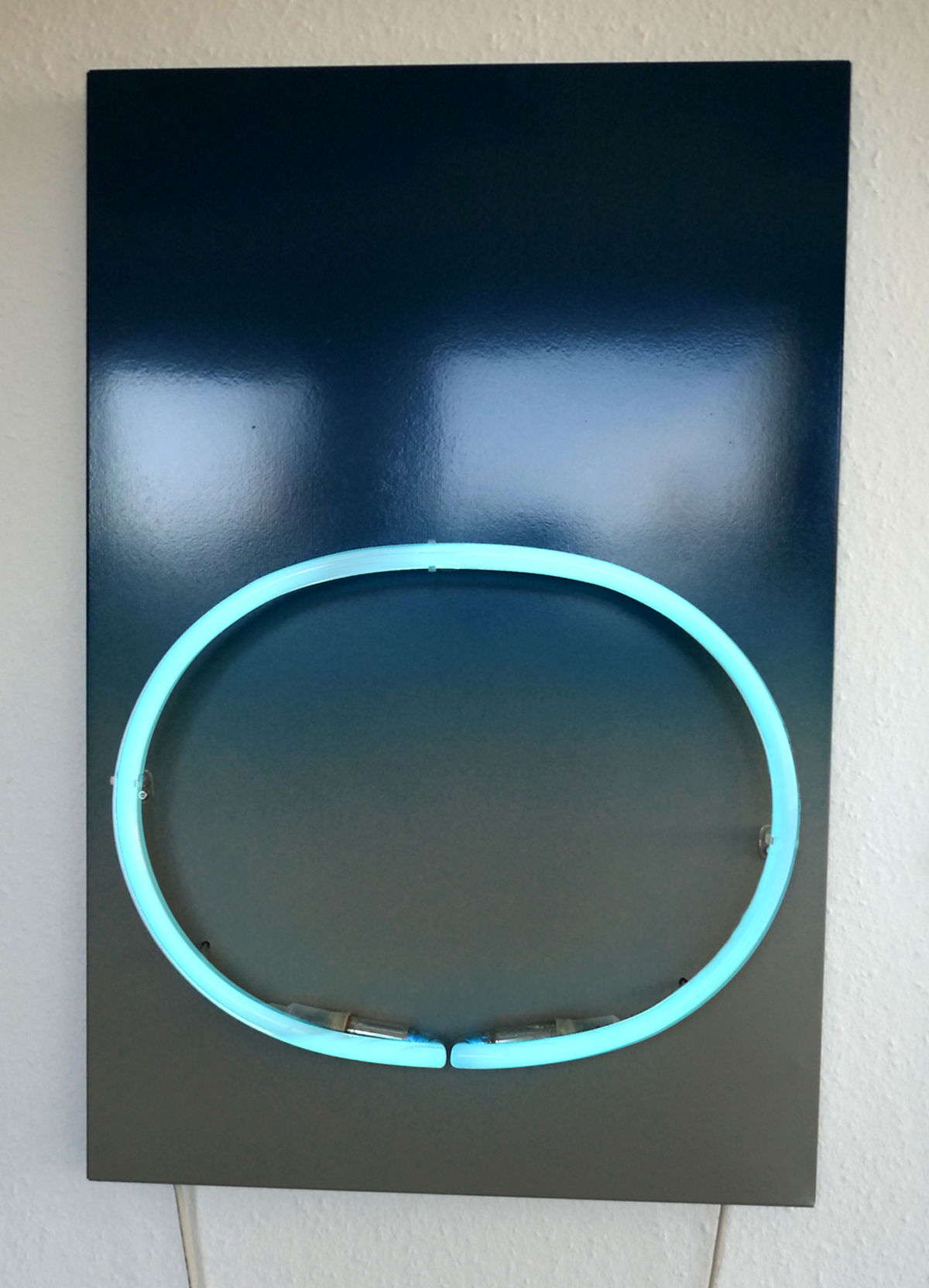 Blue Milkshake is part of the Neoncore series. For this series of mexied media objects i treat metal floor panels with a powdercoating of two colors. The paint is finsihed with a transparent layer, so the colors stay vivid. Onto the panels, freeform neons are attached.